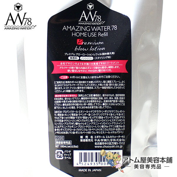 【定形外送料無料!】AMAZING WATER 78 アメイジングウォーター 78 プレミアム ブローローション 180mL レフィル【AW78 寝ぐせ直し インバス アウトバス インナートリートメント アミノ酸 ハリ 補修 詰替用 詰め替え用 業務用】